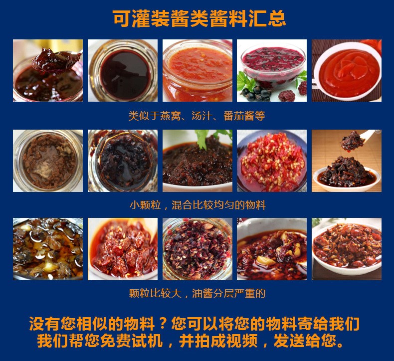 該生產(chǎn)線(xiàn)適合中小口徑三旋、四旋玻璃瓶調(diào)味醬的分裝,適合醬料、含顆粒黏稠物料的灌裝,物料接觸部分均采用316不銹鋼