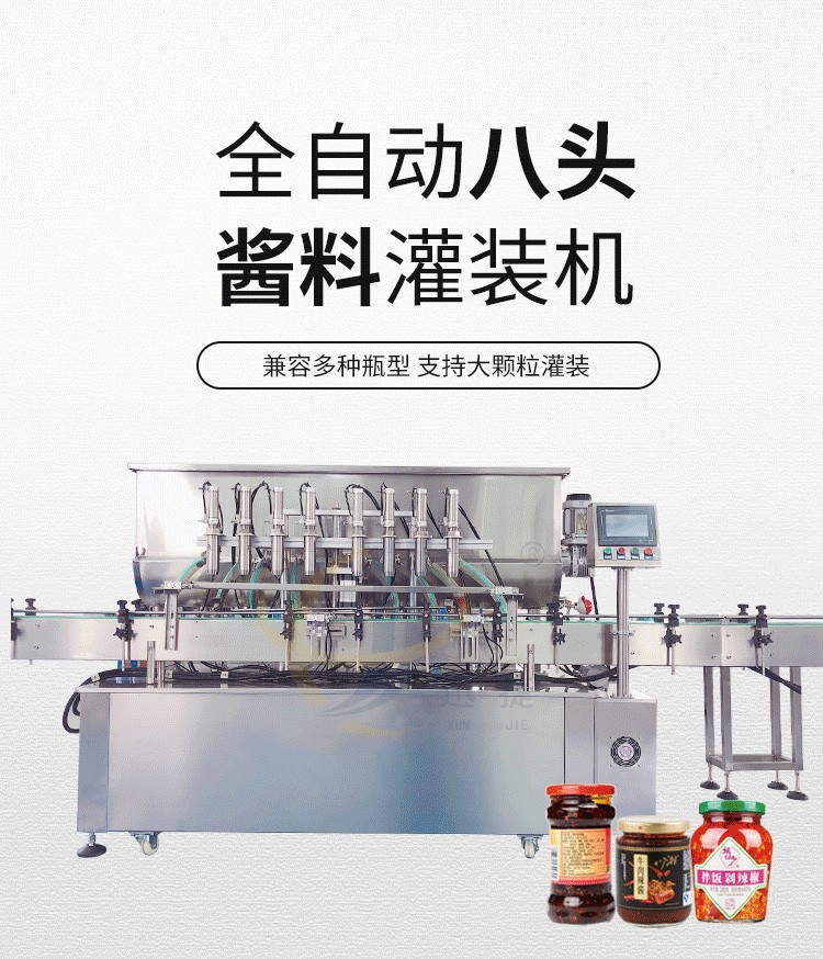 全自動八頭醬料灌裝機采用活塞式灌裝原理,適用于調(diào)味品中帶顆粒并且濃度較大的辣椒醬、豆瓣醬、花生醬、香菇醬、果醬