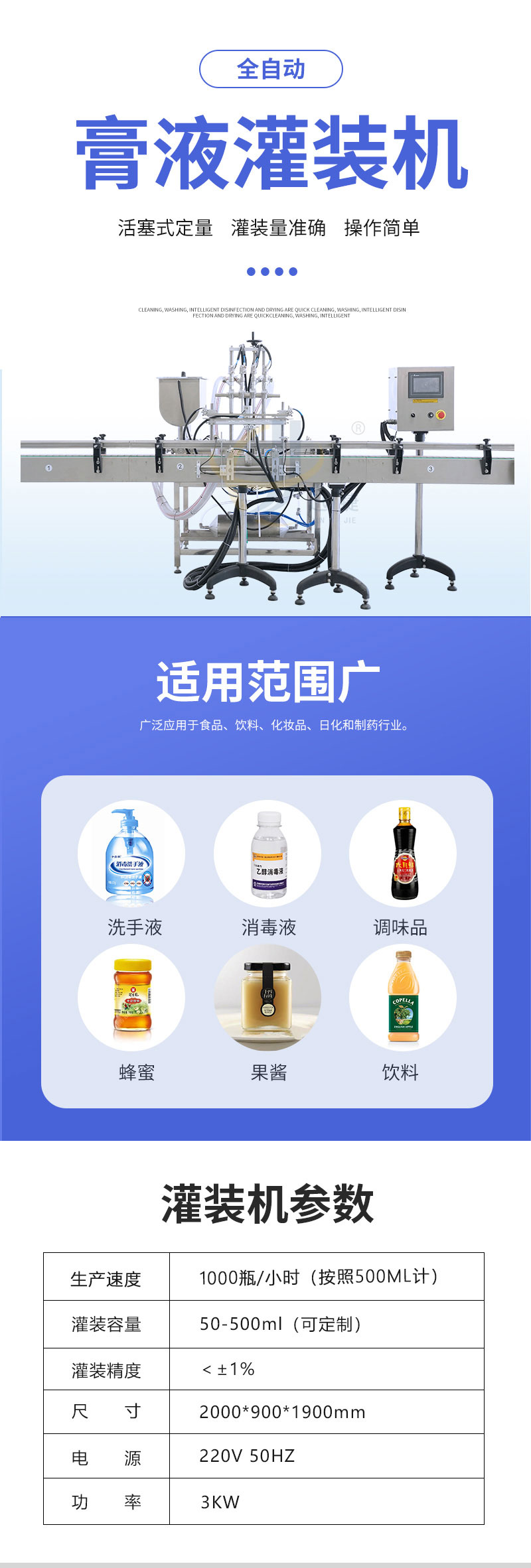 全自動膏液灌裝機適用于食品、飲料、化妝品、日化和制藥行業(yè)。灌裝頭設有特殊防漏裝置,灌裝無拉絲,滴漏現象。