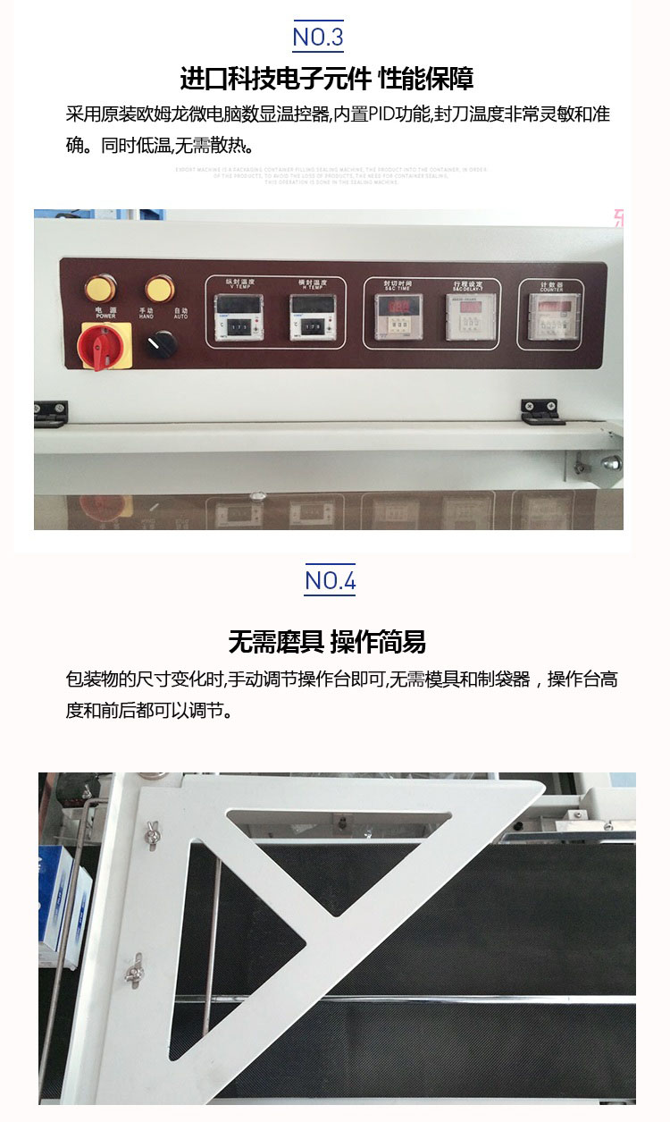 采用國際先進(jìn)控制元件;封刀采用特殊設(shè)計,封口牢固、不開裂、不粘刀;