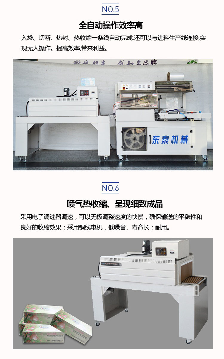 自動塑料膜熱收縮包裝機結(jié)構(gòu)緊湊占地面積小,非常適合配套自動包裝流水線完成產(chǎn)品的自動無人化包裝,適合于單個物品包裝或有底托物品包裝。自動送膜打孔裝置和手動調(diào)節(jié)的導(dǎo)膜系統(tǒng)以及手動調(diào)節(jié)的進(jìn)料輸送平臺,可適于不同寬度和高度的產(chǎn)品,實現(xiàn)一臺機器滿足各種尺寸的包裝物品。