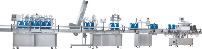 灌裝機(jī)+提蓋理蓋機(jī)+旋蓋機(jī)+鋁箔封口機(jī)+貼標(biāo)機(jī)